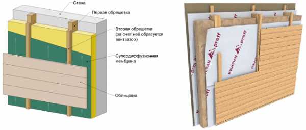 Подготовительные работы и технология крепления бруса к стене, укладки и крепления плит утеплителя, устройства контробрешетки для обшивки сайдингом аналогичны описанным выше. Отличие от однослойного утепления состоит в следующем.