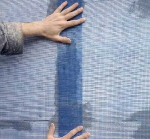 При армировании уже установленных плит сетка крепится к стене с нахлёстом в 10 см. Армирующая сетка должна вдавливаться в армирующую массу (обычно это специальный клеевой состав), а не крепиться непосредственно к утеплительным блокам. Нельзя приклеивать сетку к плитам из пенопласта или минераловаты на клеевые лепёшки.
