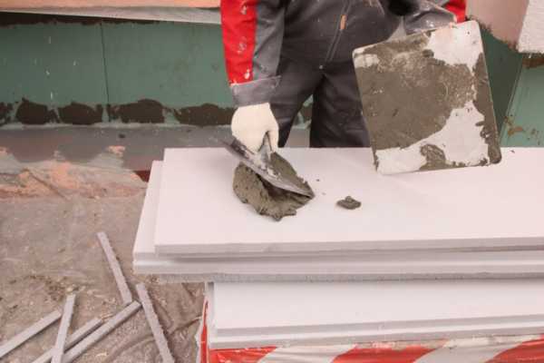 С пенопластом несколько проще. Если стены ровные, то клей просто наносится на всю поверхность плиты. Если же есть неровности, то слой стоит сделать толще, особенно по краям, а в центр наложить 2-3 клеевые лепёшки.