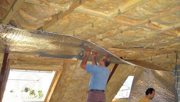 - 3. После установки листов приступают к монтажу пароизолятора. Использовать его нужно при утеплении как ватой, так и пенополистиролом. Если этого не сделать, на изоляторе будет скапливаться конденсат, в результате чего он потеряет свои теплозащитные качества. В особенности это касается минеральной ваты. Крепят пароизолятор, прибивая его к стропилам брусочками толщиной около 3см. Фольгированный материал устанавливают фольгой в сторону чердака;