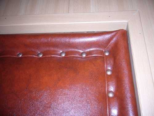 - Посредством степлера дверь обтягивается основной заготовкой по краям, затем при наличии крупных щелей прибиваются боковые рейки, которые предварительно необходимо обернуть поролоном. После чего из предварительно вырезанных полос материала формируется рамка, которая фиксируется посредством мебельных гвоздей.