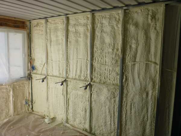 У этого материала много сходства с монтажной пеной. На заранее подготовленную стену при помощи специального оборудования наносится пенополиуретан. Обрешётка из деревянных брусочков служит основанием для наносимого материала. Сверху такие стены обшиваются гипсокартоном.