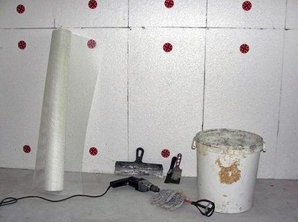 Укладывают пенопласт на поверхность, используя для скрепления строительный клей, щедро наносят на всю площадь листа.
