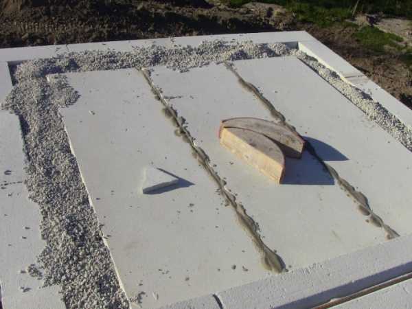 - когда гидроизоляция просохла, клеим плиты пенополистирола, используя специальный клеевой состав;