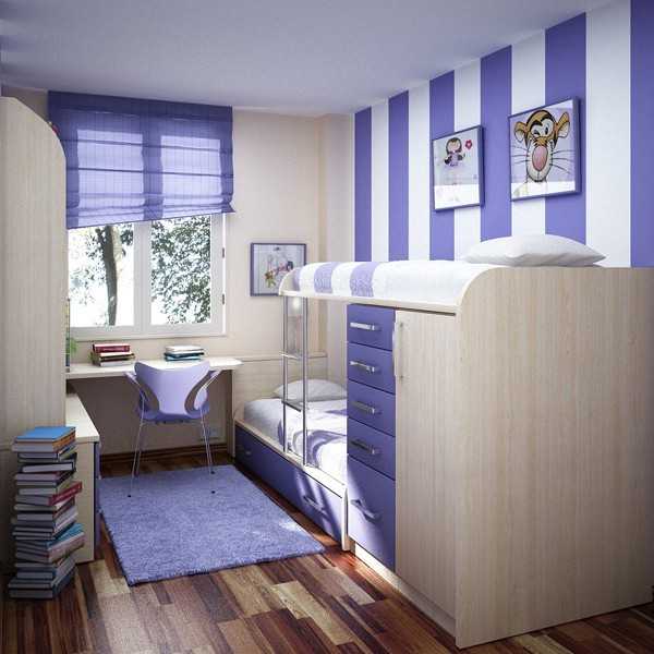 Дизайн узкой детской комнаты для девочки, мальчика и двух детей: фото интерьера