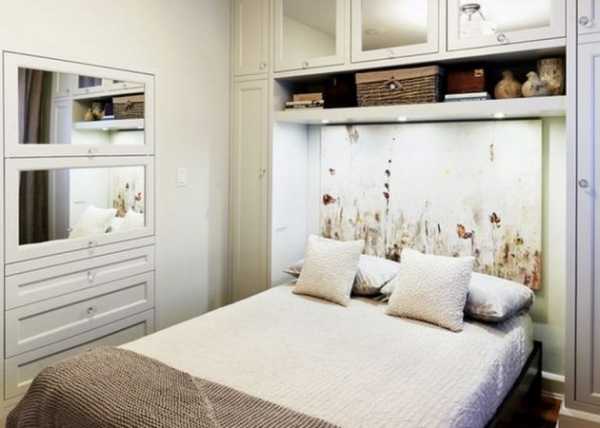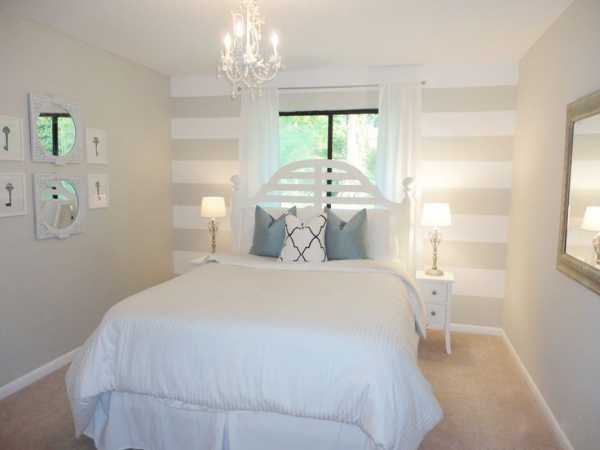 В случае, когда спальня получается совсем маленькой, попытайтесь расширить торцевую стену с изголовьем декораторскими приемами: например: оформить ее зеркалами или обоями с оптическим эффектом.