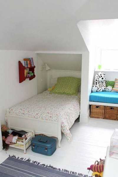 Не стоит загромождать узкую комнату для ребёнка предметами, как на фото, так как интерьер и так тесен. Лучше отказаться от излишних конструкций в детской, желательно постелить на напольную поверхность мягкое ковровое покрытие, набросав поверх него множество игрушек.