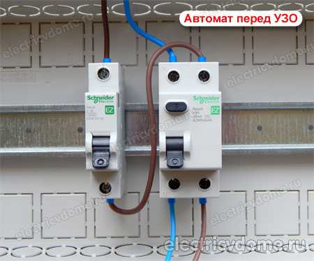 УЗО+«автомат» Следует отметить, что УЗО, так же как и остальные электроприборы в доме, должно находиться под защитой автомата. Последний не допустит воздействия токов большой силы (токов короткого замыкания) на силовые контакты УЗО, сохраняя тем самым его работоспособность. Поэтому УЗО всегда устанавливается строго после автоматического выключателя.