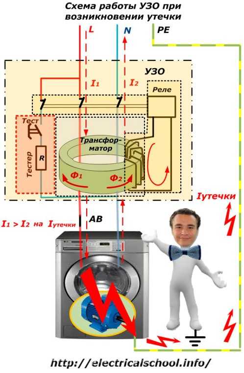 При возникновении утечки опасный потенциал стекает на землю через защитную шину РЕ. В обмотке реле наводится ЭДС от возникшего небаланса магнитных потоков (токов в фазе и нуле).