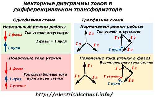 У однофазной цепи сравниваются подходящий к измерительному органу вектор тока фазы и выходящий из нее — нуля. При нормальном режиме работы с надежной целой изоляцией они равны, уравновешивают друг друга. Когда возникает неисправность в схеме и появляется ток утечки, то баланс между рассматриваемыми векторами нарушается на его величину, которая замеряется одной из обмоток трансформатора и передается блоку логики.