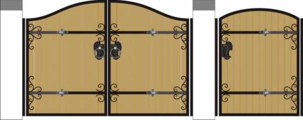 - Распашные ворота с калиткой — дань классике и традициям. Выглядят элегантно и богато, удобны в пользовании. Это обычная конструкция для ворот, которая состоит из двух створок, прикрепленных завесами к опорам. Створки к распашным воротам могут быть различных форм: прямоугольные, округлые, треугольные, зигзагообразные, арочные и т. д.;