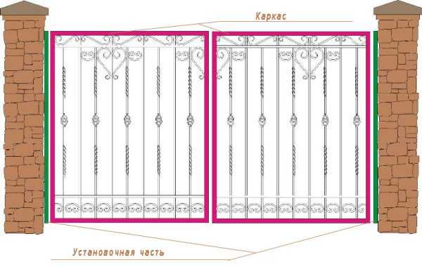 - Открытые кованые ворота состоят из рамки, прутьев и приваренных к ним декоративных элементов;