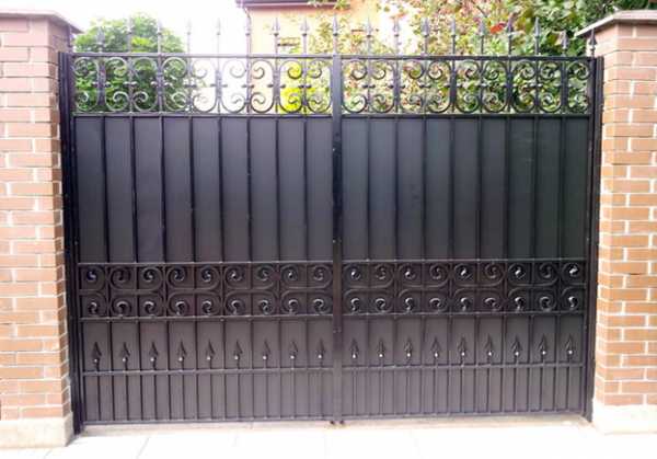 Главное особенностью данных разновидностей вопрос, что видно на картинке выше, является их массивность и закрытость. Во всех моделях применяется листовое железо, которым полностью закрывается фронт ворот, аналогично оформляется забор для создания цельного ансамбля. Также обязательным элементом, который придает воротам статусности и эксклюзивности, является наличие кованных или литых объемных элементов оформления, выполняющих роль украшательства, размещаемых на воротах. Еще одной важной деталью становится комплектация готовых ворот засовами и нащельниками.