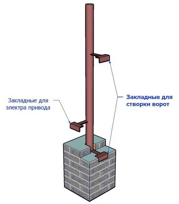 Установка столба заключается во вкапывании трубы, трамбовки основания с использованием щебня и окладкой трубы кирпичами. Также на данном этапе потребуется наварить шинки, специальные крепления для обратных завесов створок ворот. Бывает достаточно всего двух шинок, но в случае, если ворота предполагают быть тяжелыми, можно наварить три для верности.