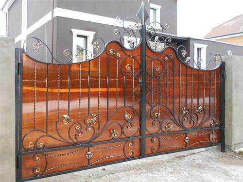 Отдельное место среди кованых ворот занимают модели, в которых удачно сплотились дерево и металл. Сами ворота в данном случае изготавливаются из дерева, материала, который издревле используется для оформления загородного дома, а все крепежи, окантовка, наличники и просто элементы украшения, изготовлены посредством ковки. Также аналогично изготавливаются наконечники, в случае решения их создать.