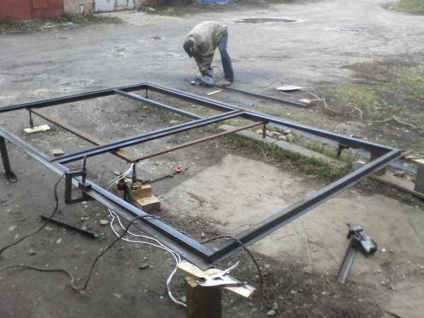 Для сваривания створок следует выбирать ровный участок, чтобы не допустить перекручивания деталей каркаса. Подготовленный профиль требуется раскроить в соответствии с чертежом, после чего каркас выкладывается на ровной площадке и точечной сваркой прихватываются все части створа.
