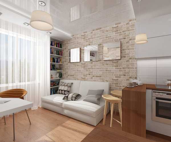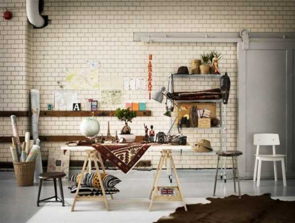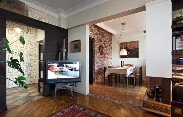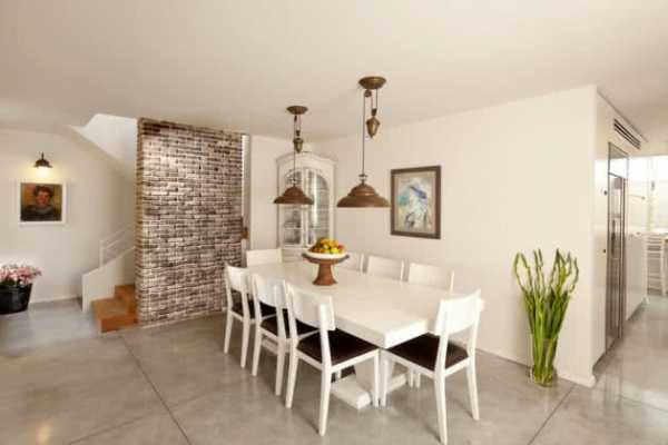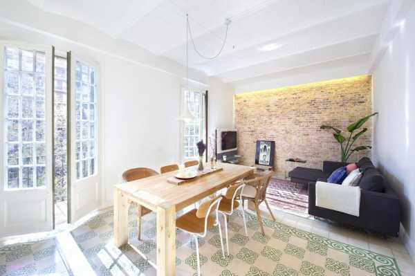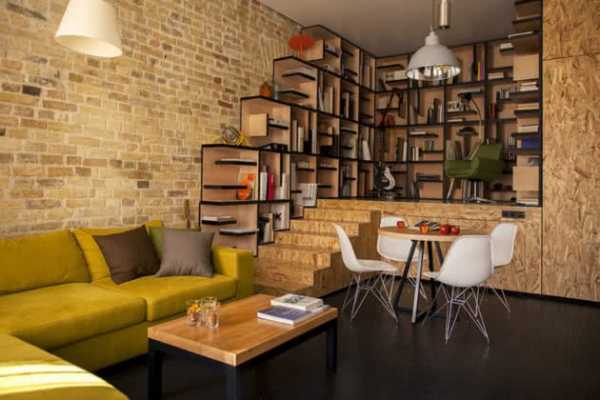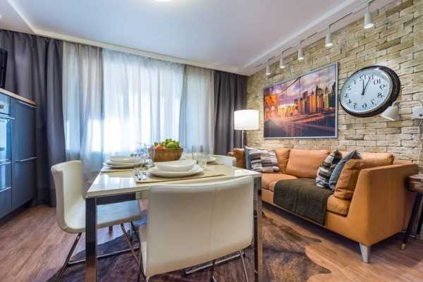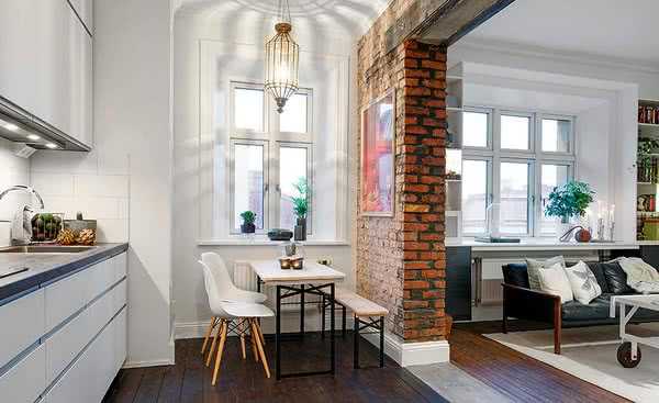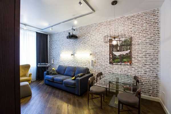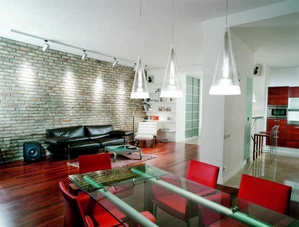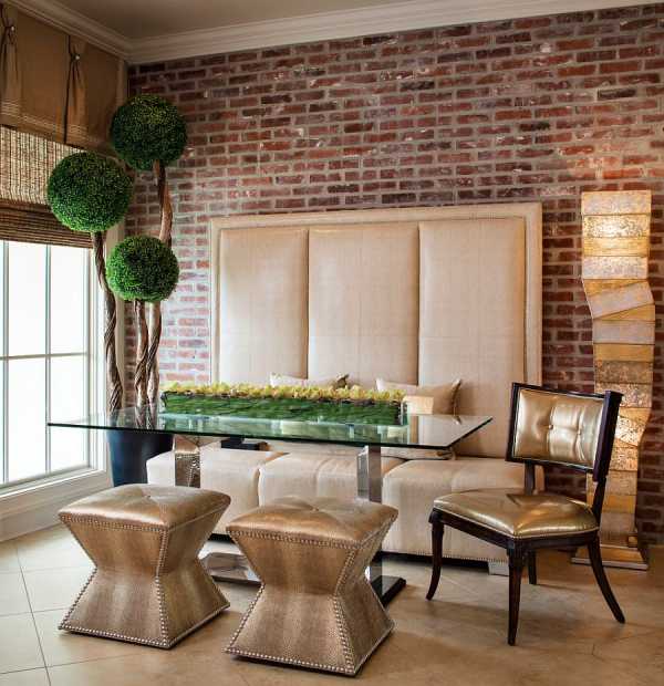 Большинство жителей постсоветского пространства не могут похвастаться избытком квадратных метров, находящихся в их собственности. Поэтому часто гостиная совмещает в себе несколько функций: здесь располагается еще и обеденная или даже рабочая зоны. Частичная укладка кирпича на стене у зоны, не предназначенной для размещения гостей, станет дополнительным способом ее выделения. Совсем необязательно соблюдать симметричность выкладки: к примеру, кирпичом может быть выложен один угол.