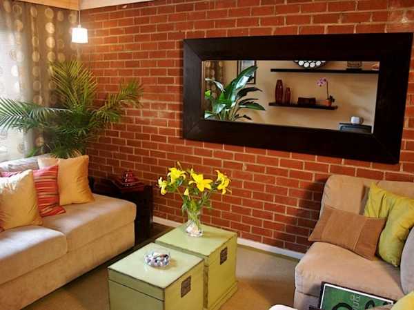 К этому же способу укладки кирпича в гостиной относится и выкладывание кирпичом стационарной перегородки, предназначенной для зонирования гостиной или ее отделения от соседней комнаты.