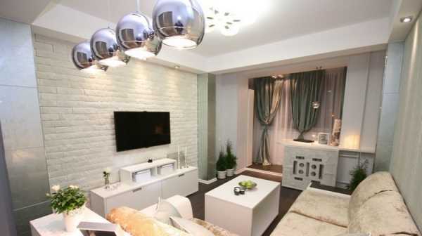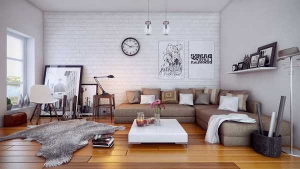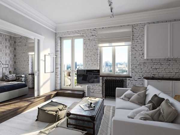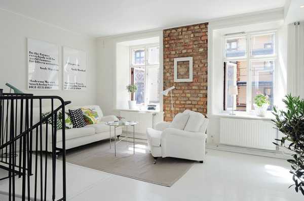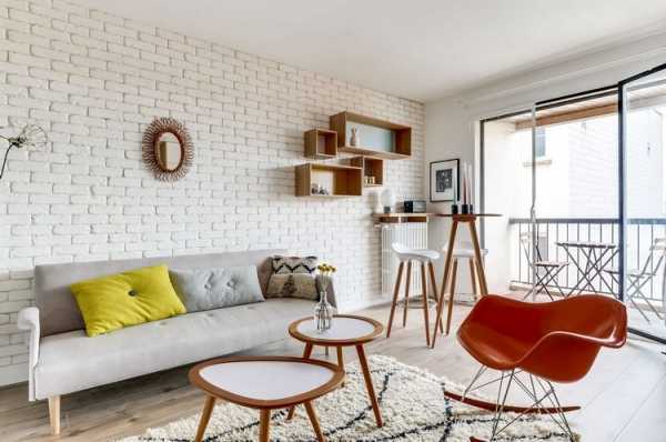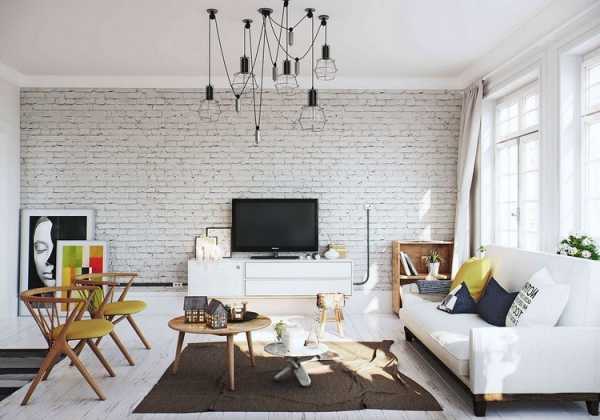 Белая кирпичная стена в интерьере гостиной небольшого размера