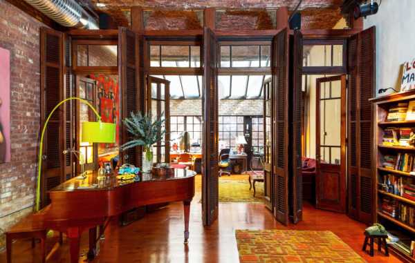 Кирпичная кладка хорошо сочетается с таким материалом как дерево. В данной гостиной деревянная перегородка, представляющая собой ряд раздвижных дверей по типу жалюзи, разделяет жилое пространство на две зоны. Кирпич в купе с деревянным лакированным полом, мебелью и роялем смотрится органично и стильно.
