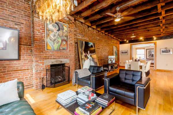 В данном интерьере представлено не декорирование стены под кирпич в гостиной, а самая что ни на есть оригинальная кирпичная кладка начала XX века – именно тогда был построен дом, в котором располагается эта просторная квартира. Хозяева решили не закрывать этот фрагмент стены, напротив, выбрав белый цвет в качестве основного для жилого пространства, они подчеркнули «исторический характер» простенка между окнами, сделав его композиционной доминантой. Неоднородный цвет кладки, широкие и глубокие швы между кирпичами создают колоритную структуру стены и богатую светотень. Единственным элементом декора на данной поверхности является лаконичная рама для картины.