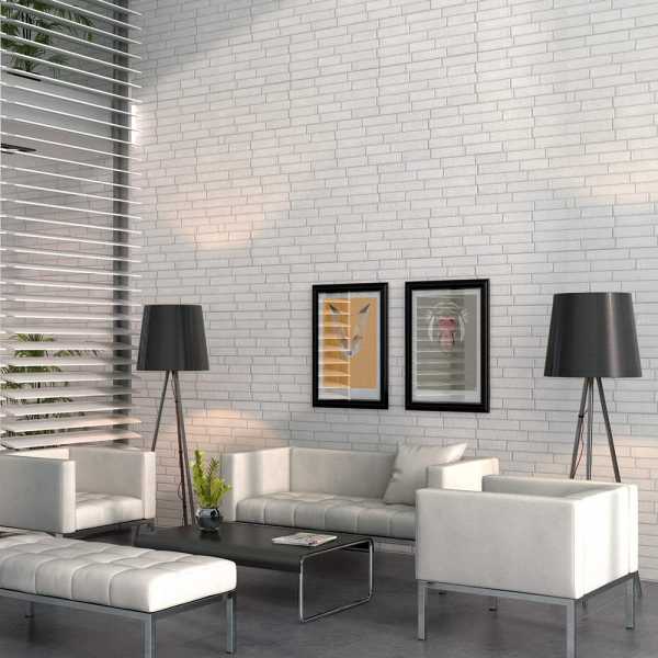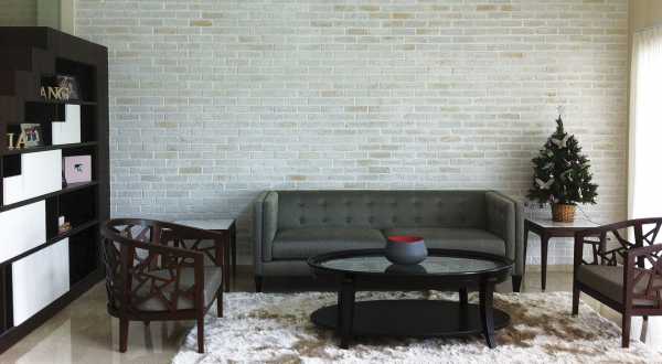 Изящная гостиная с кирпичной стеной из имитирующей натуральную кладку плитки, станет отличным решением для тех, кто желает привнести индивидуальность в помещение, без сложных процессов подготовки и покраски кирпича.