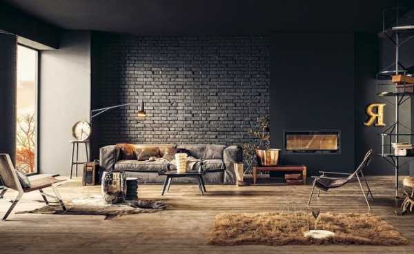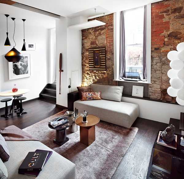 Кирпичная стена своему появлению обязана популярным промышленным зданиям, в которых модно было устраивать жилые площади. Кирпичная стена – это визитная карточка стиля лофт в гостиной. Покупая недвижимость в старых брошенных производствах, люди старались сохранить кирпичную кладку, а в некоторых интерьерах оставляли открытыми все коммуникации.