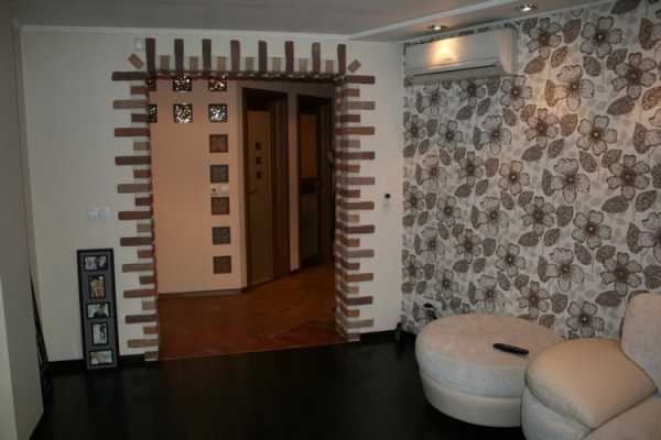 Оформление дверной арки настоящим кирпичом в интерьере современной гостиной