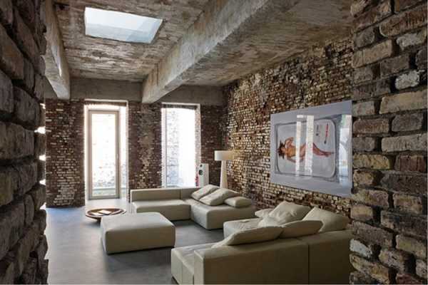 Еще получить возможность наслаждаться нестандартным видом стены в гостиной – использовать для кладки кирпич, бывший в употреблении. Найти его не составит особого труда – в черте каждого города есть немало заброшенных зданий, частично или полностью построенных из кирпича.