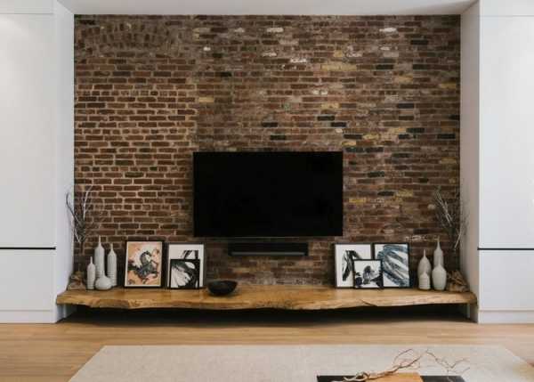 Кирпичная стена – это идеальный фон для современной техники, например, телевизоров. А сделать интерьер гостиной более утонченным помогут:
