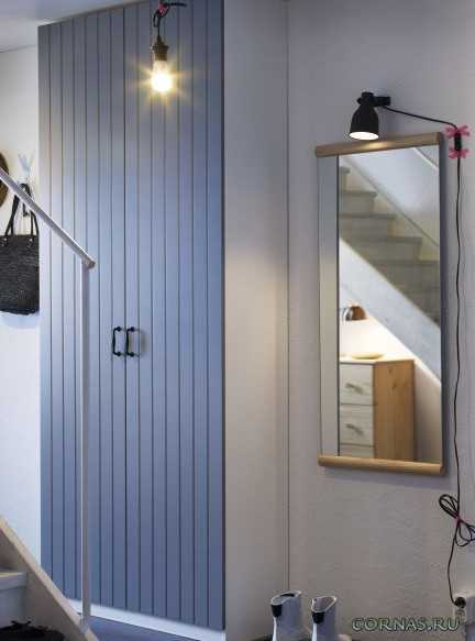 Шкаф на лестничной клетке удобен тем, что вы можете хранить в нем коньки, лыжные ботинки, зимнюю обувь. В этом случае потребуются полки не из ДСП, а из ПВХ. Они не уступают мебельным полкам по прочности и не боятся сырости.