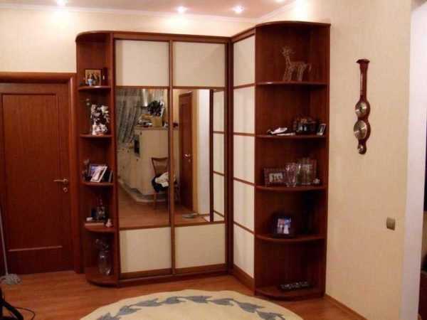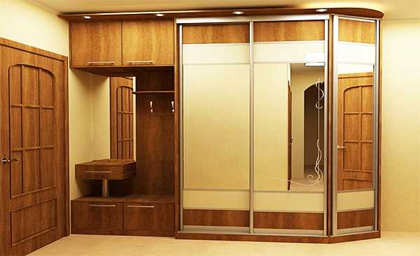 - радиусные — оригинальная корпусная мебель устанавливается в свободном углу, имеет красивую форму полукруга. Интересная модель является отличным дизайнерским решением для небольших прихожих, не имеет острых углов, обеспечивают максимально безопасное передвижение жильцов по стесненному в размерах помещению.