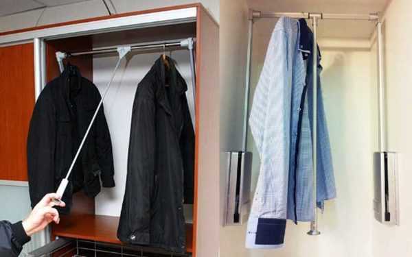 При ширине шкафа купе 45 см и менее, надо искать выдвижную конструкцию — поперечные (фронтальные) штанги, на которых вешалки висят параллельно двери, а не боком к ней. Подобные конструкции крепятся чуть выше уровня головы — так удобнее. Вам надо поднять руку и повесить вешалку. Потому примерно на этом уровне крепится полка, а к ней уже штанга.