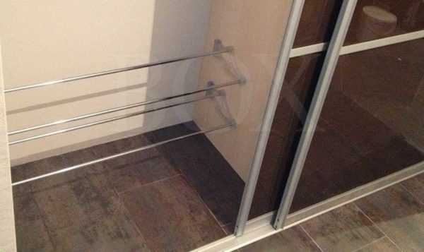 Под обувь отводится нижняя часть шкафа купе. Для хранения обуви удобнее устанавливать не полки из ЛДСП, а сетчатые. Во-первых у таких полок лучше «просматриваемость», во-вторых на них не скапливается пыль и грязь, в-третьих, удобно ставить обувь на каблуках.