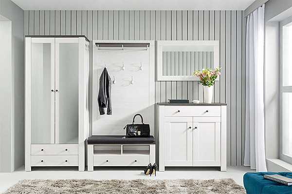 Ну если речь идет не о маленьком пространстве, и покупаете прихожую вы не в хрущевку, то вариантов обстановки коридора у вас больше. Можете позволить себе целый гарнитур-прихожую, в составе которого будет и шкаф-купе. Например, модный нынче, радиусный (закругленной формы). Что же тогда еще будет в комплекте?