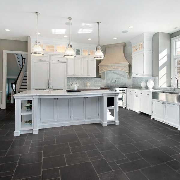 Важно! На слишком светлых и темных напольных покрытиях хорошо видны любые загрязнения и крошки, поэтому для кухни оптимальной цветовой гаммой станут сероватые или коричневые тона.