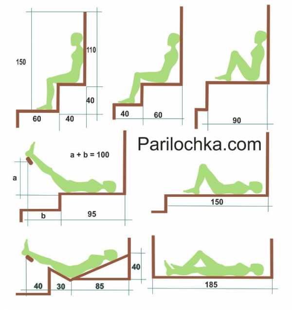 На этой схеме показано, как обычно сидят или лежат в бане. Вы видите, что минимальная ширина сиденья должна быть не менее 40 см, а 60 см в глубину достаточно для того, чтобы сидеть, удобно отклонившись к стенке. Глубины сиденья в 90 см уже достаточно для того, чтобы сидеть на нем, подобрав под себя ноги.