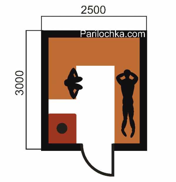 Вот и считаем — на двух сидящих ширина полков будет 80 см, если в два уровня. Для одного лежащего и одного парующего — 100 см. Плюс «пятно» печи (смотря как располагать).