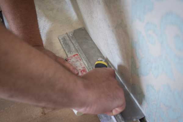 Подрезку в углу делают следующим образом: в угол, параллельно стене с верхним полотном, ставится шпатель. Далее ножом делаем разрез, причем одновременно двух слоев. Затем снимается отрезанный кусок с верхнего полотна, после – отгибается верхнее полотно, и вытягиваются обрезки с нижнего.