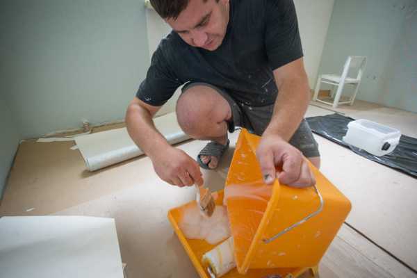 Готовый клей переливают в ванночку: так будет удобнее набирать клей на валик и отжимать излишки.