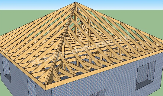 Для обустройства четырехскатной (вальмовой) крыши требуется иная стропильная система: к стандартной двухскатной системе добавляются особые элементы – стропильные ноги треугольной формы.