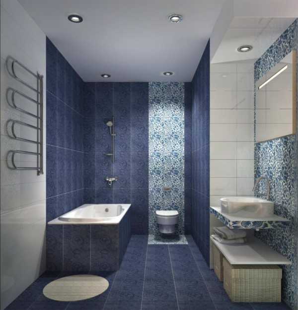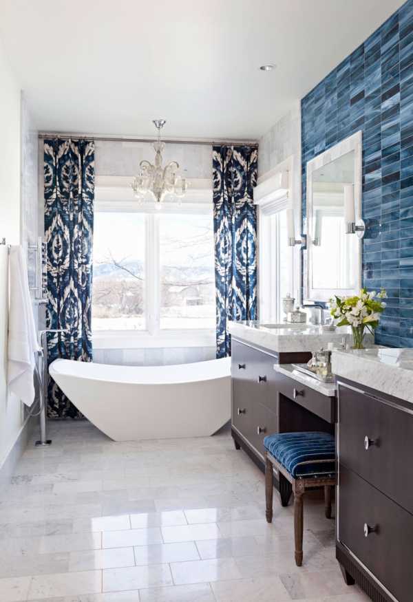 - Голубые и синие акценты. Так как ванна ассоциируется в первую очередь с водой, то и использование синих и голубых материалов и аксессуаров в ней стало популярным ходом. Часто используются приглушенный синий и фиолетовый, а также пастельный голубой, так как сильно яркие цвета не помогут расслабиться на все 100%.