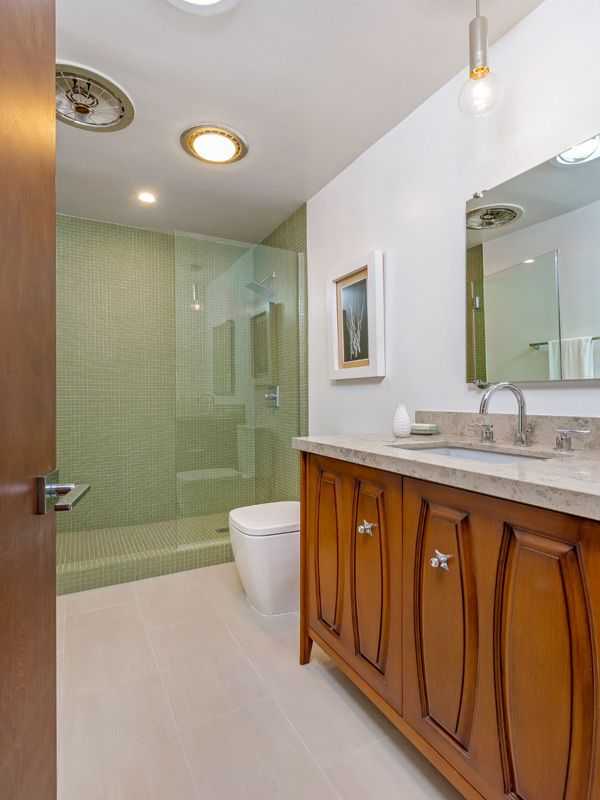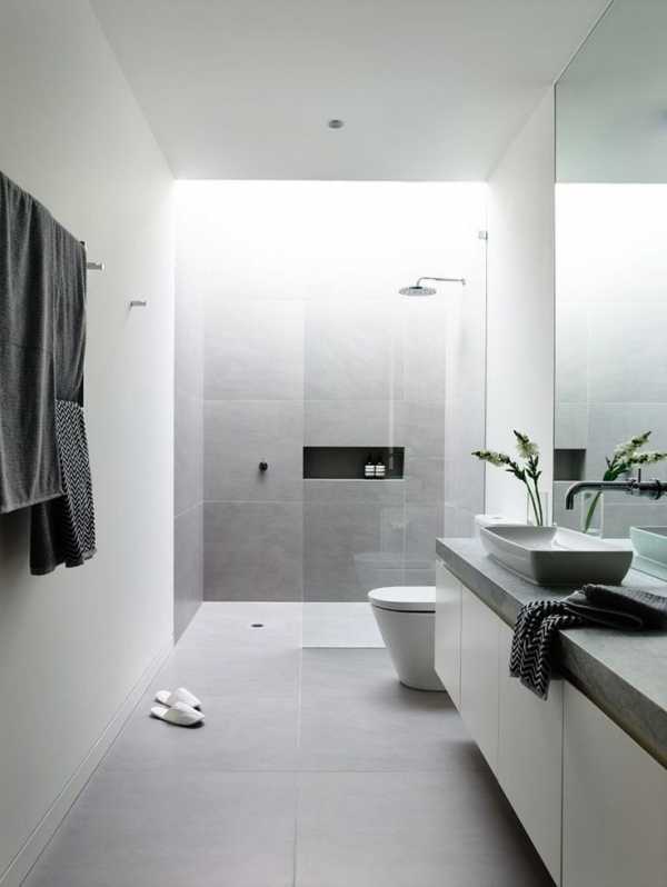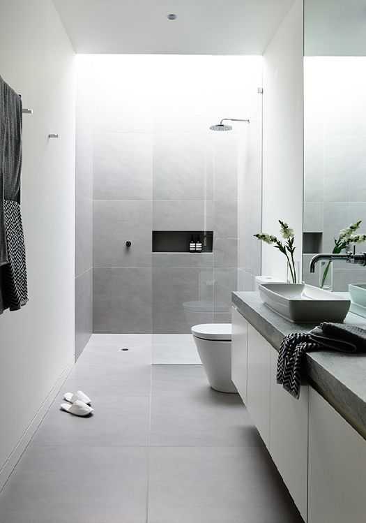 Простота является одним из основных правил для создания современного интерьера. Открытое, незагроможденное пространство с использованием встроенных стеллажей и шкафчиков для предметов личной гигиены смотрится стильно и привлекательно.