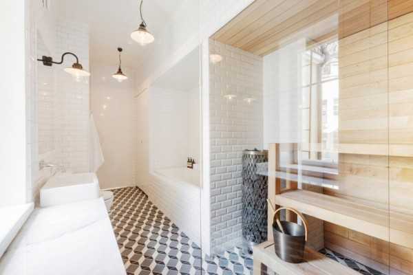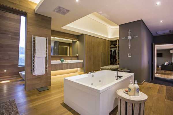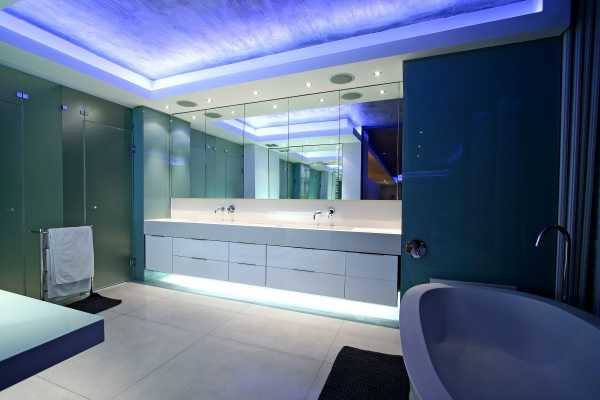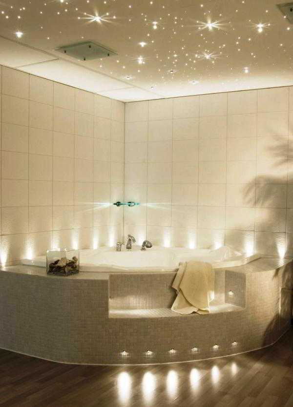 Изобилие подсветки и теплый пол, встроенная в пол купель делают комнату технологичной