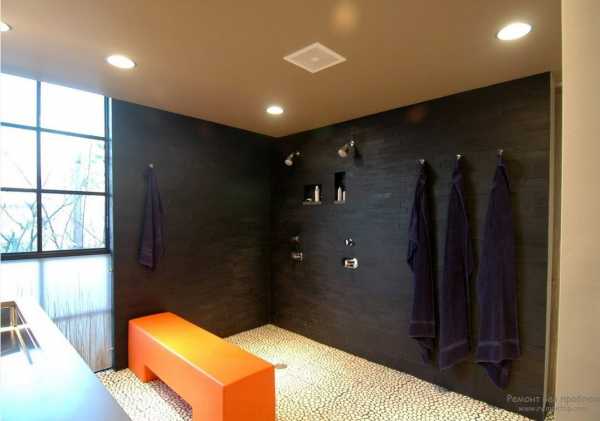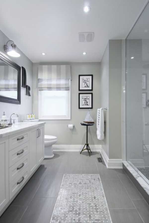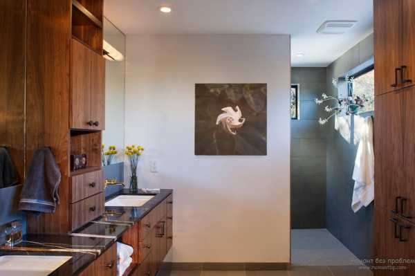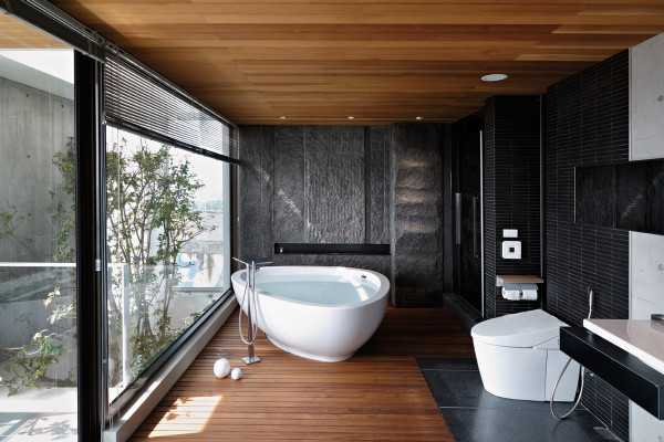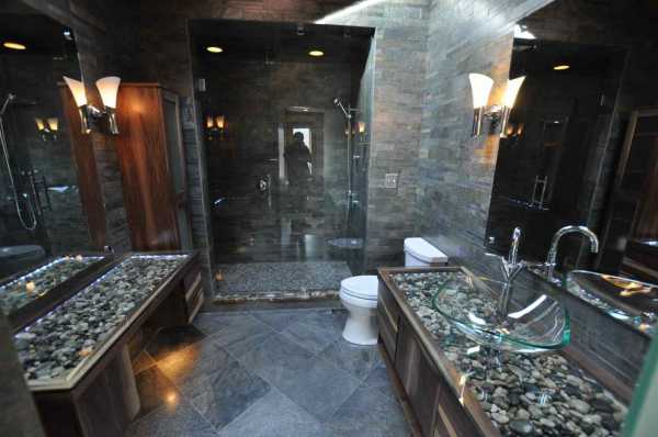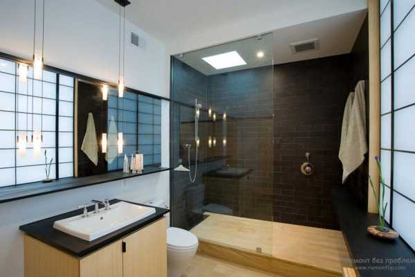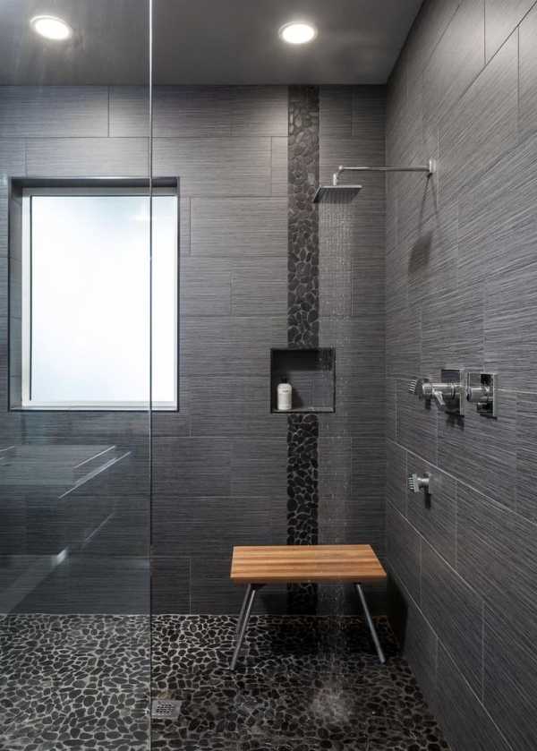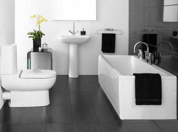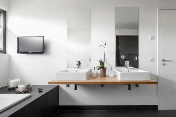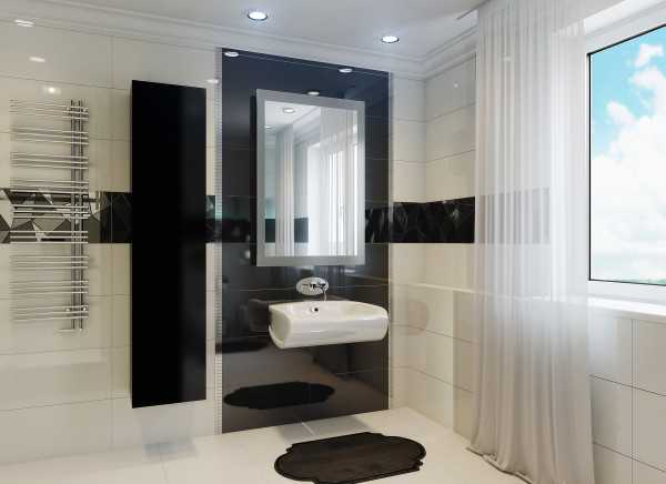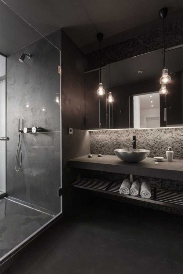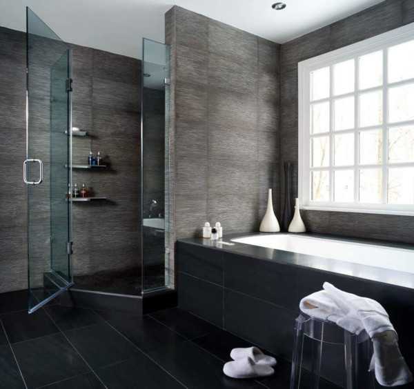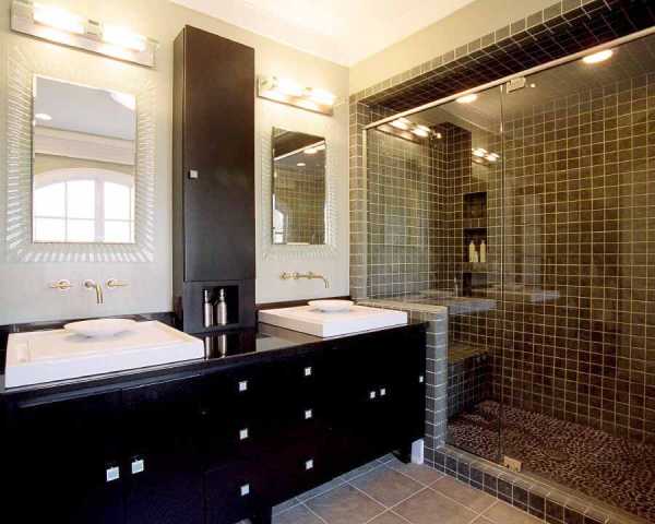 Для более строгих в плане лаконичности стилей, особенно для хай-тека и минимализма, характерно использование темных оттенков – серого, черного и их вариаций. Большой популярностью пользуются черно-белые и серо-белые ванны, а также сочетания серого/черного с деревом.