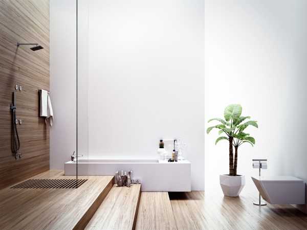 - Больше дерева. Так как дерево активно используется и в минимализме, и в эко-стиле, и в скандинавских интерьерах, в ванную часто вводят отделку древесиной в качестве базового оттенка. Дерево выглядит и роскошно, и уютно, а также сочетается и с темными, и со светлыми оттенками.