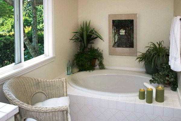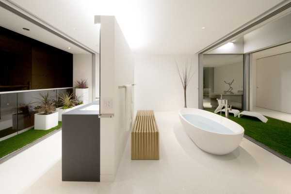 Очень частый атрибут современной экологичной ванны – живые клумбы или ковры с имитацией травы