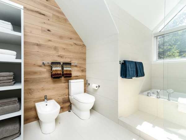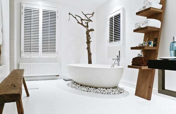 Дерево и камень отлично сочетаются с белым цветом сантехники
