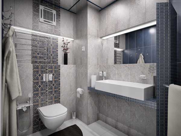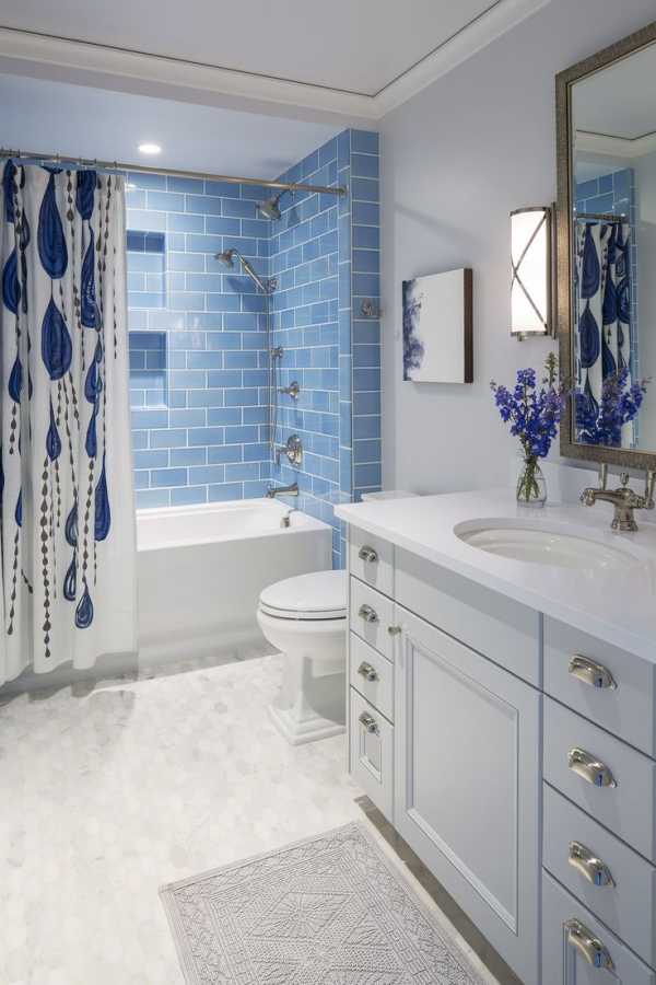 Сочетание синего, серого и белого выглядит очень изящно, а еще – подходит для компактных ванных комнат