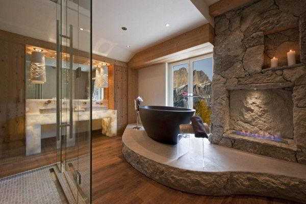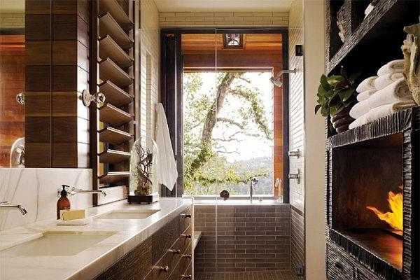 Интерьеры ванных с камином выглядят аристократично и привлекают внимание своей оригинальностью.
